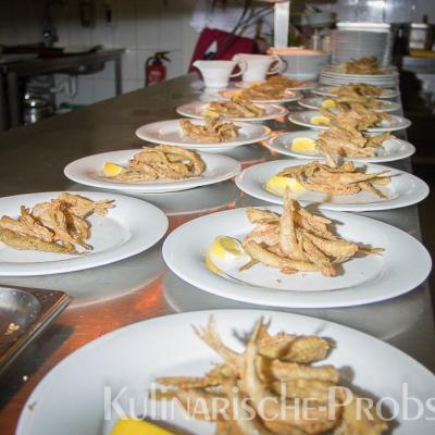 Nachfolgend sehen Sie die Zubereitung im Hotel Am Rathaus, Schönberg. Hier wird der Stint erst mit grobem Buchweizenmehl mehliert und dann kross und saftig gebraten. Dazu servierte man im Hotel Am Rathaus frischen Gurkensalat, zwei Sorten Kartoffelsalat und Salzkartoffeln mit ausgelassener Butter: