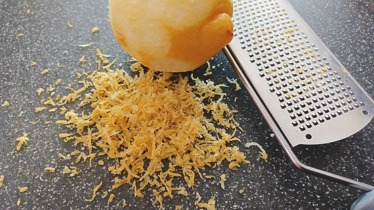 2. Die Schale von einer unbehandelten Bio-Zitrone dazuraspeln (oder mit einem Zestenschneider Zesten abschneiden und diese dann sehr klein schneiden).