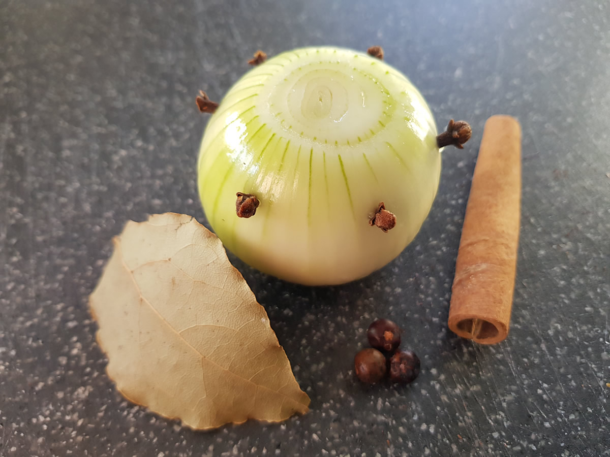 Vor dem Servieren die gespickte Zwiebel mit den Nelken, die Wacholderbeeren und das Lorbeerblatt entnehmen und ggf. noch einmal abschmecken.
