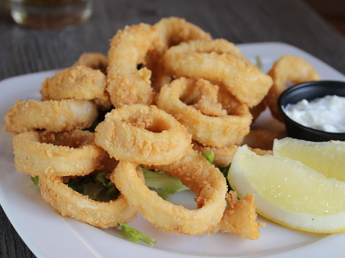 Richten Sie die Tintenfischringe auf Tellern an und servieren Sie die Zitronenstücke dazu.