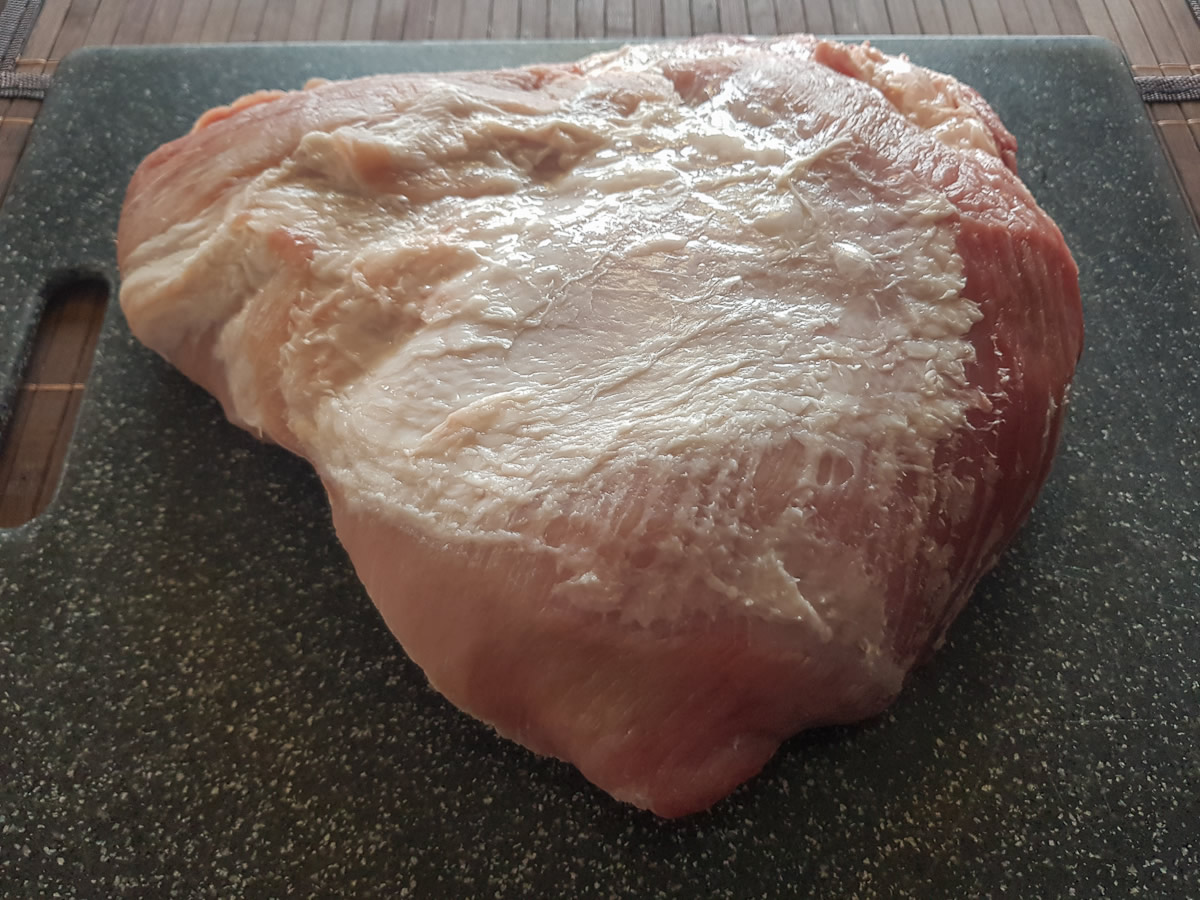 Nun die Dicke Rippe vollständig mit dem Senf bestreichen, mit dem gehackten Knoblauch und dem Zucker bestreuen, mit dem Salz und dem Pfeffer würzen und abschließend auch noch das Paprikapulver darüber verteilen.