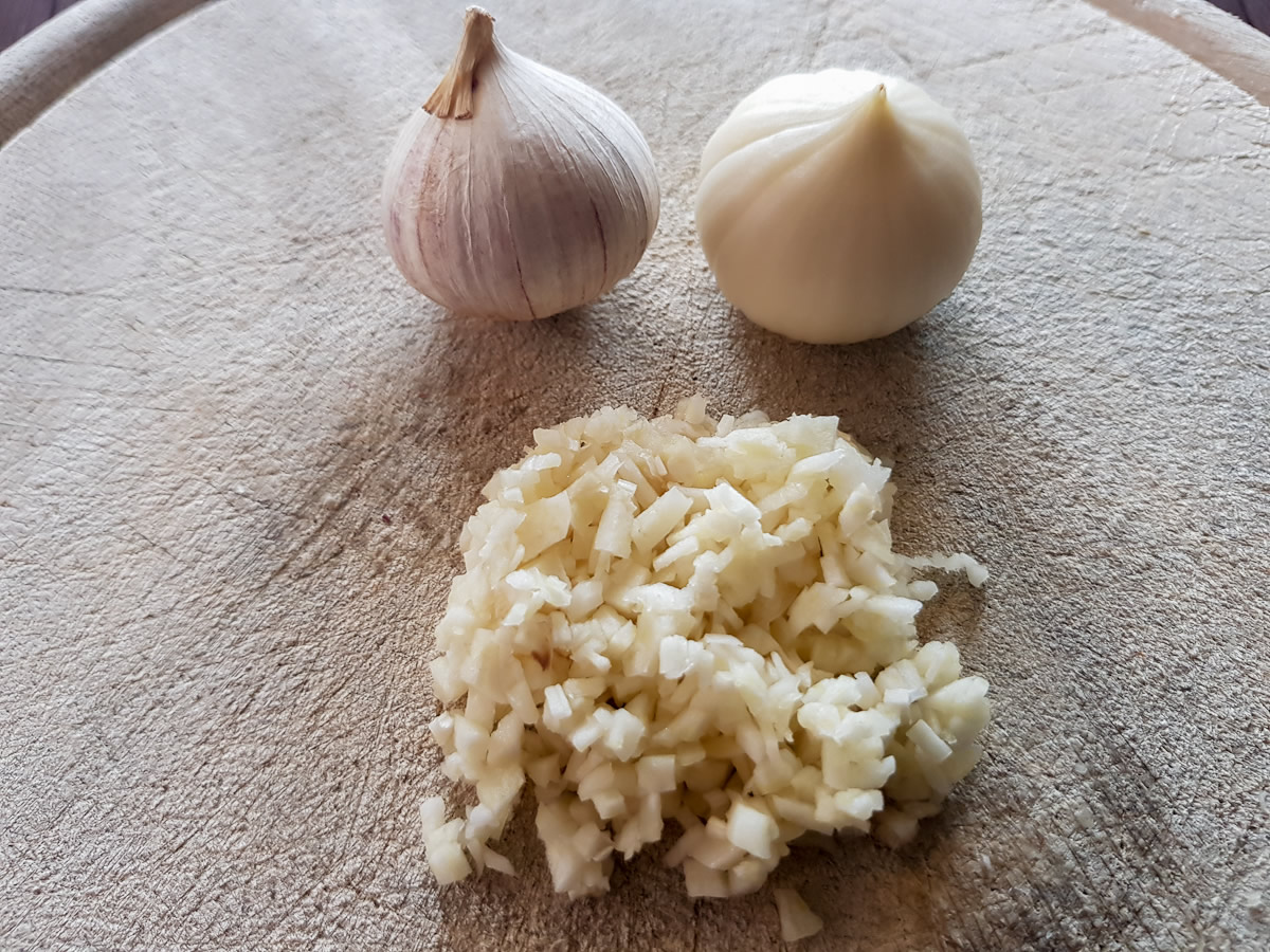 Den Knoblauch sehr fein hacken oder pressen.