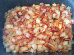 Die Zwiebelstücke hineingeben und andünsten. Dann das Tomatenmark hinzugeben und alles zusammen weiter anbraten.