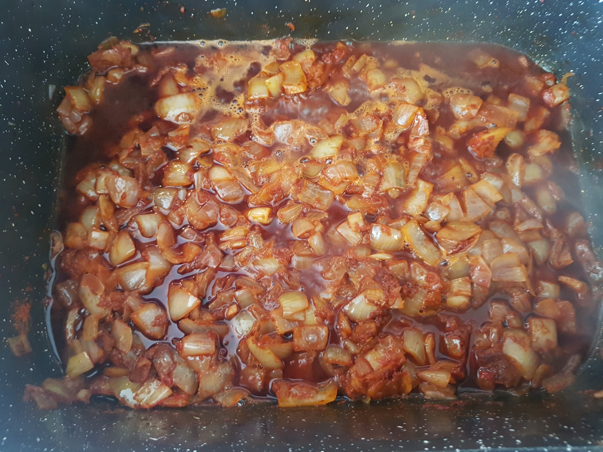 Geben Sie dann die Zwiebeln hinein und lassen Sie sie anbraten, aber nicht zu dunkel werden.