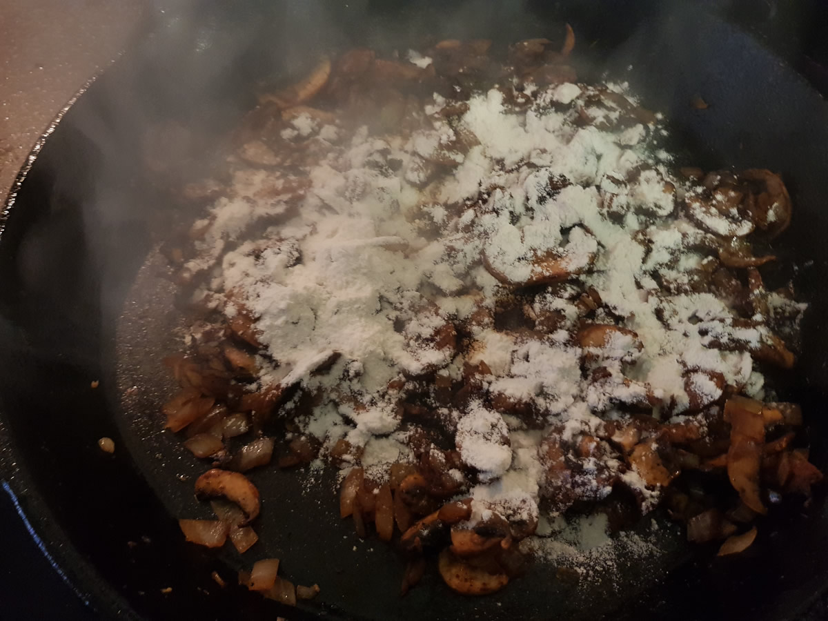 Die Champignons mit dem Mehl bestäuben und kurz anschwitzen. Die Geflügelbrühe und den Weißwein hinzugeben zu den Champignons geben und unterrühren, damit sich das Mehl mit der Brühe verbindet - ein wenig köcheln lassen, so dass der Alkohol verfliegen kann. Dann im Anschluss auch gleich die Schlagsahne angießen und so lange köcheln lassen bis eine cremige Soße entstanden ist.