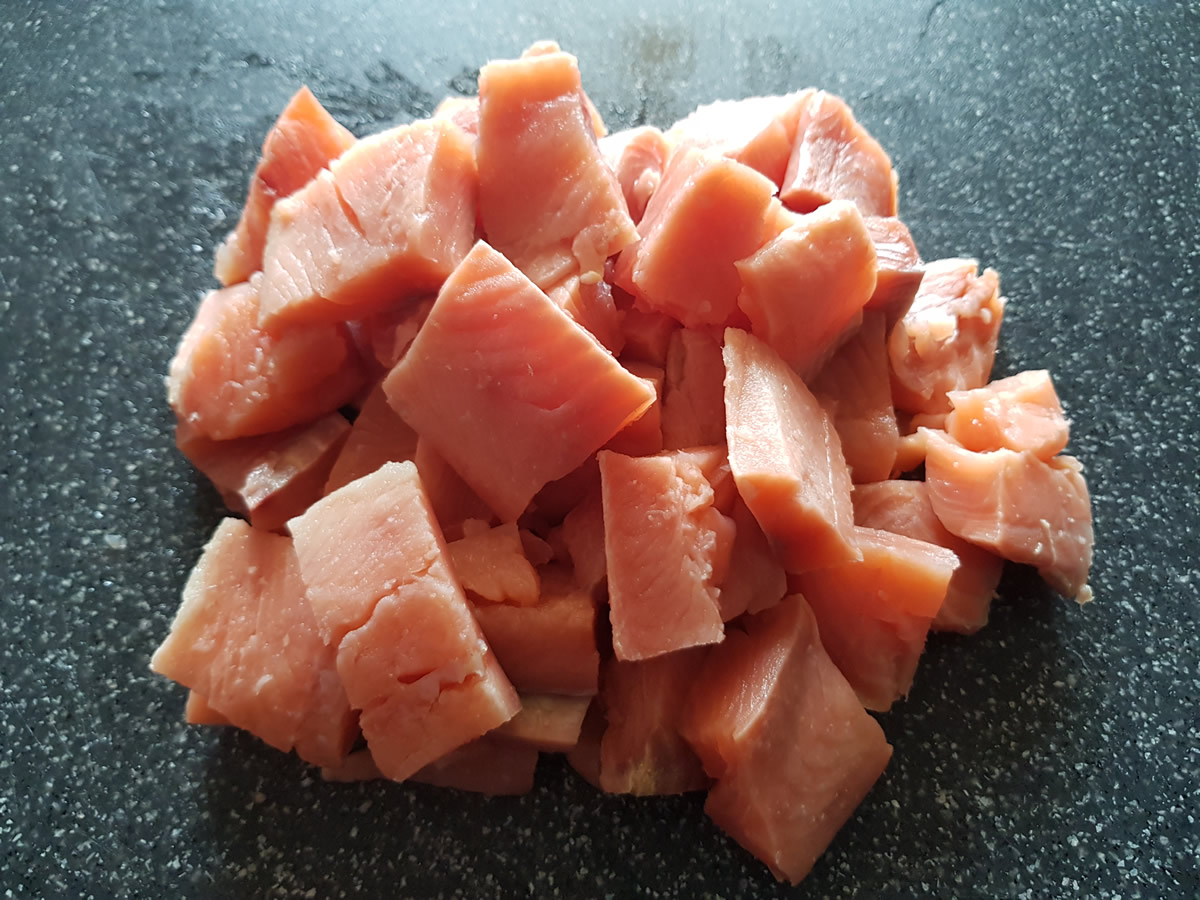 Schneiden Sie das Lachsfilet in mittelgroße, mundgerechte Stücke und stellen sie die Stücke beiseite. Pellen Sie die Schalotten und den Knoblauch - schneiden Sie beides in feine Würfel.