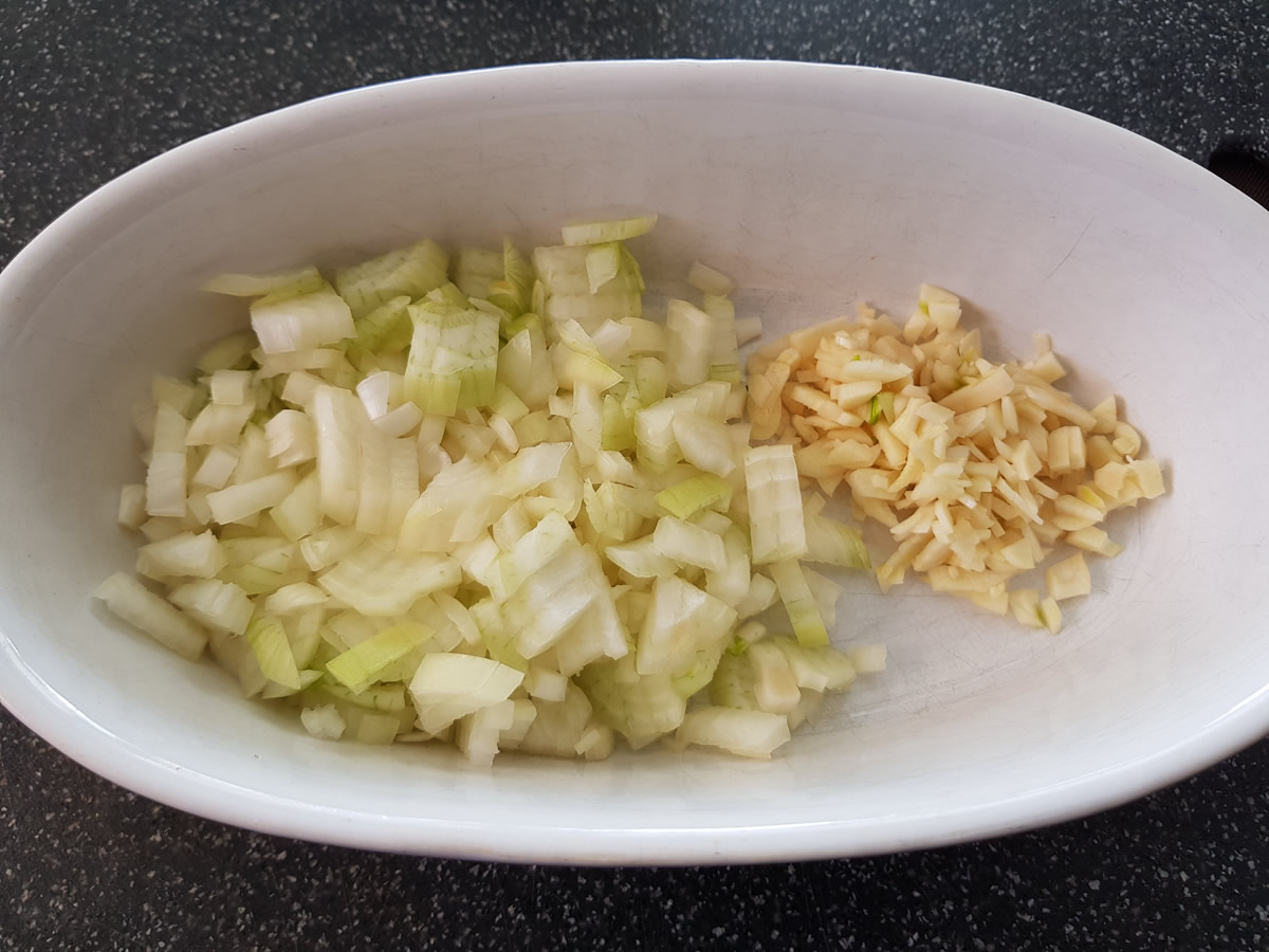 1. Die Zwiebel schälen und in kleine Würfel schneiden.