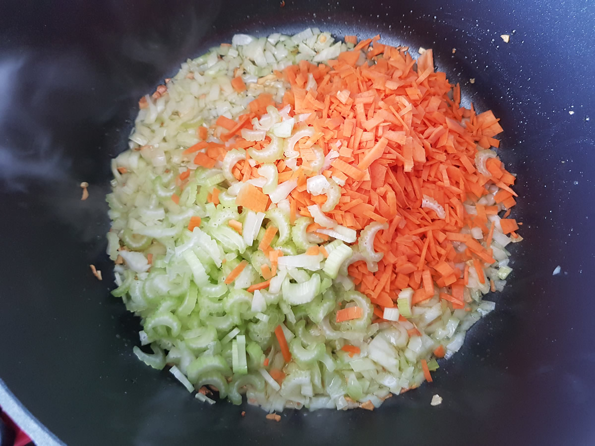Jetzt die Karotten- und Selleriestücke in den Topf geben und alles gut durchrühren.