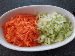 Die Karotten waschen, schälen die harten Enden vom Stiel schneiden, den Rest sehr klein schneiden.