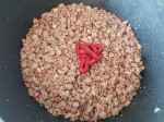 Wenn das Hackfleisch Farbe genommen hat, löschen Sie es mit einem guten Schuss Rotwein ab und lassen den Rotwein verkochen.