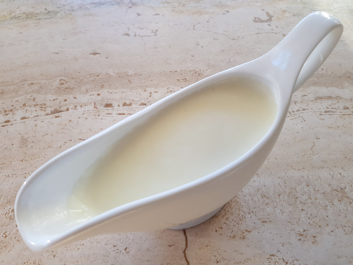 Die Milch -alles auf einmal - unter kräftigem Rühren mit dem Schneebesen in die Mehlschwitze gießen.