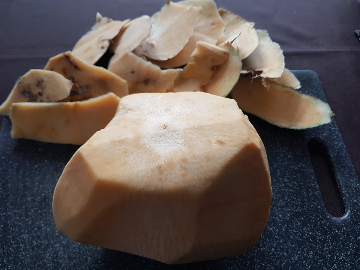Dann die Steckrüben und die Karotten schälen, in Scheiben schneiden und würfeln. Die Zwiebel pellen, in Würfel schneiden und zusammen mit den Steckrübenwürfeln und den Karotten in einen großen Topf geben.
