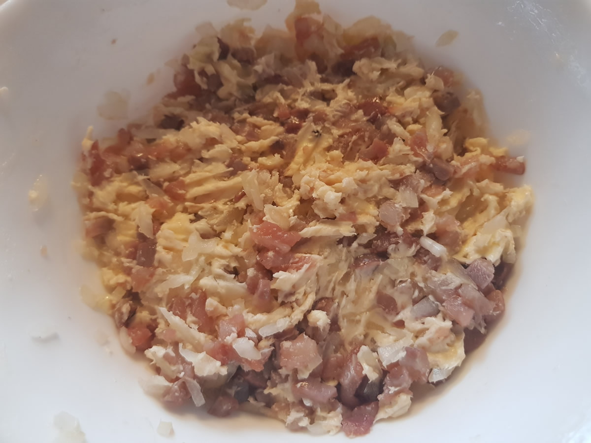 3. Schneiden Sie die Zwiebel ebenfalls in sehr kleine Stücke und geben Sie die Zwiebelwürfel zum Matjes. Mischen Sie beides gut durch.